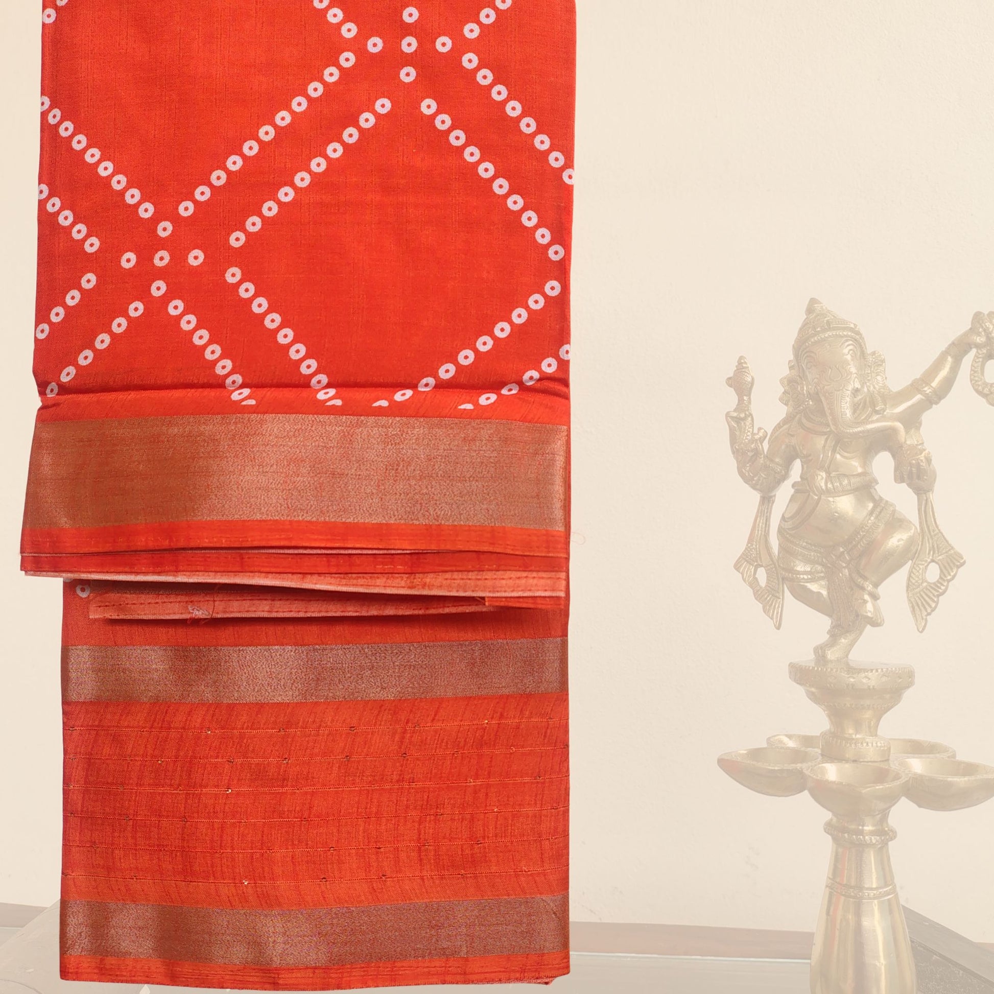 Orange – with white Bandhani dots & zari border