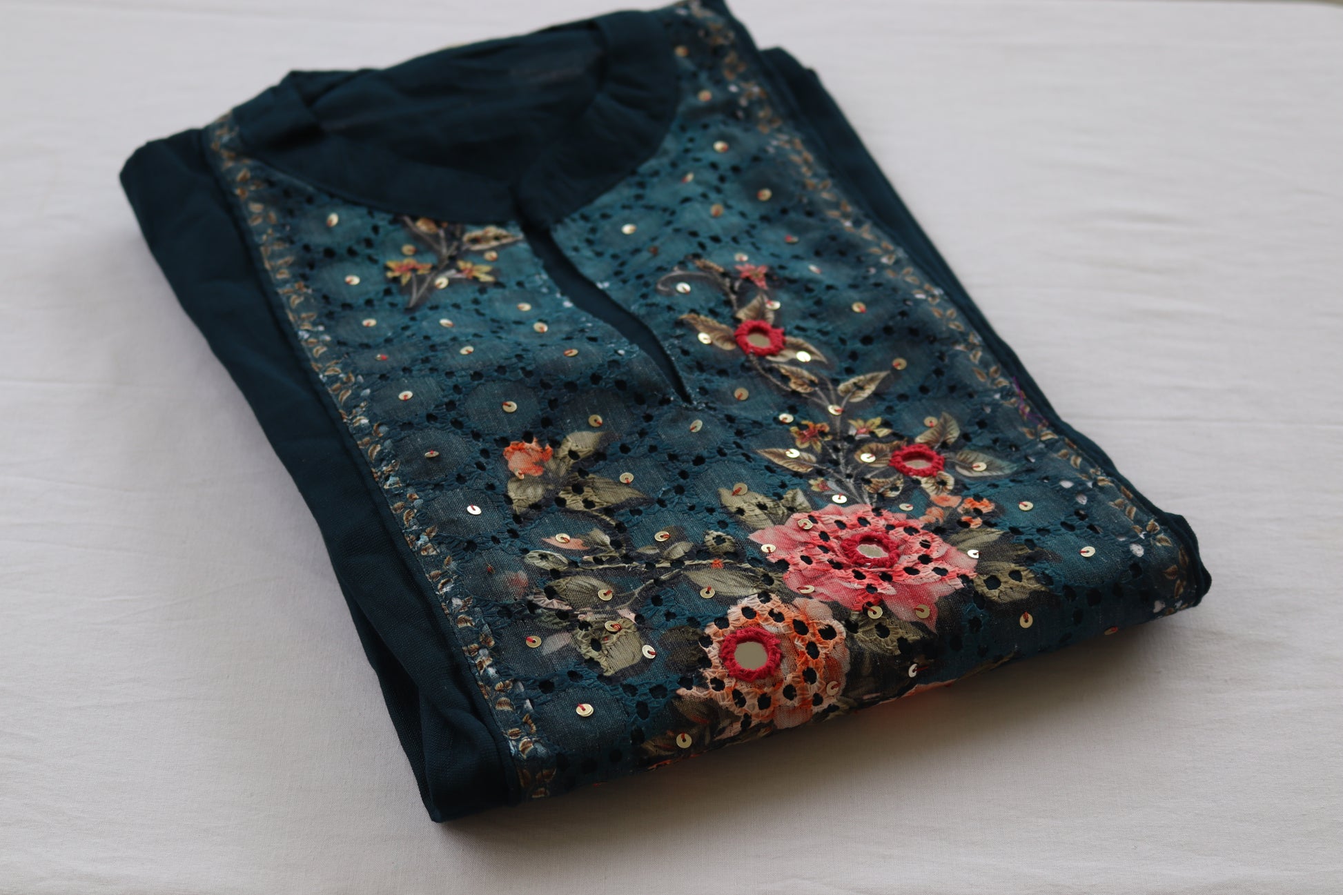 Elevate your ethnic look with the Teal Royale Embroidered Kurta Set, a perfect mix of sophistication and charm. Made from rich cotton fabric, this deep teal-blue kurta features intricate thread embroidery on the yoke and neckline, paired with a beautifully printed floral dupatta that adds a luxurious touch. The coordinated bottom completes the elegant ensemble β perfect for festive gatherings, formal occasions, and special evenings.