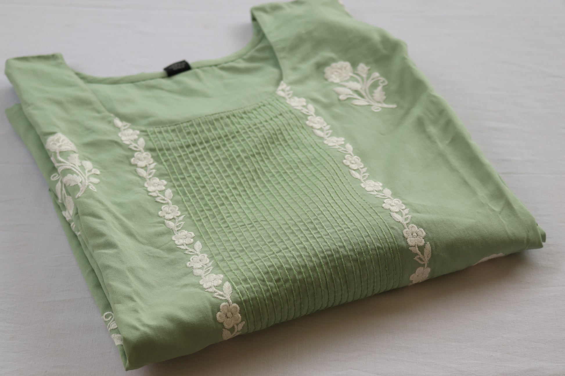 Subtle white floral embroidery on front panel
