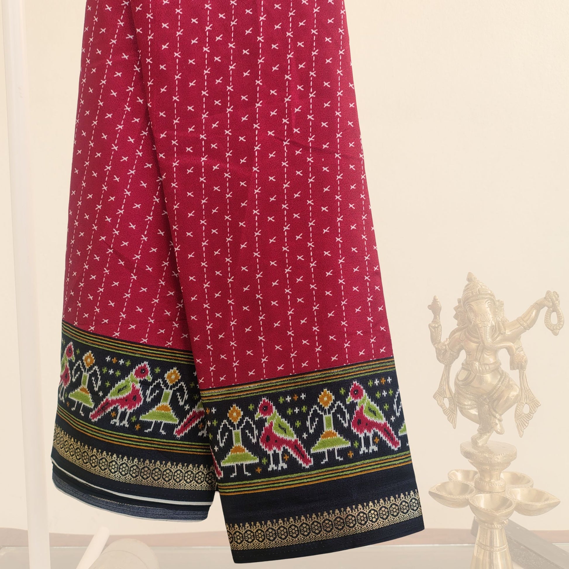 Add a splash of heritage to your look with this wine red Malgudi saree. The all-over white motifs complement the bold black border, intricately woven with colorful parrot designs. Lightweight and eye-catching, it’s an excellent choice for casual festivities, traditional functions, or everyday elegance.
